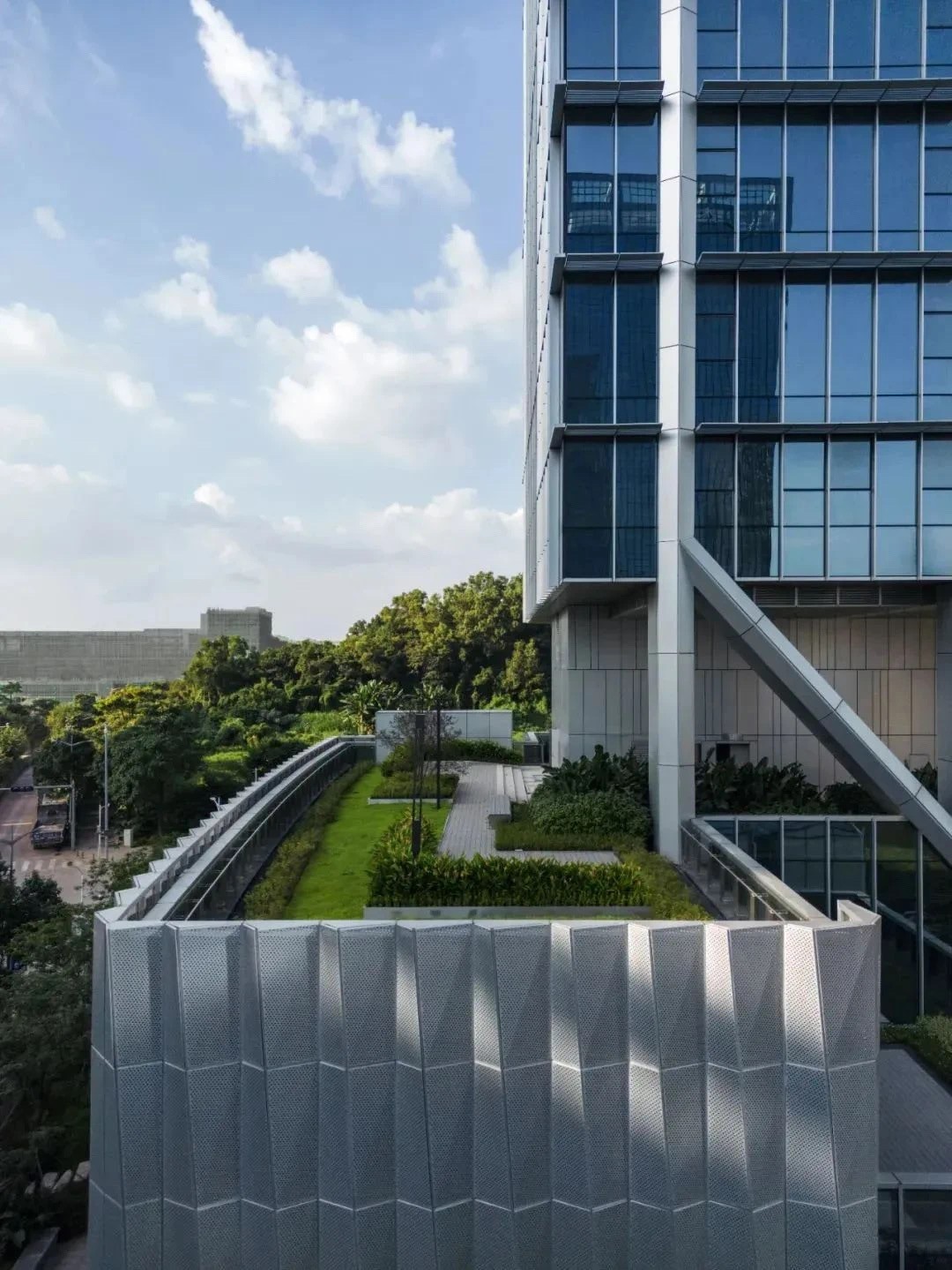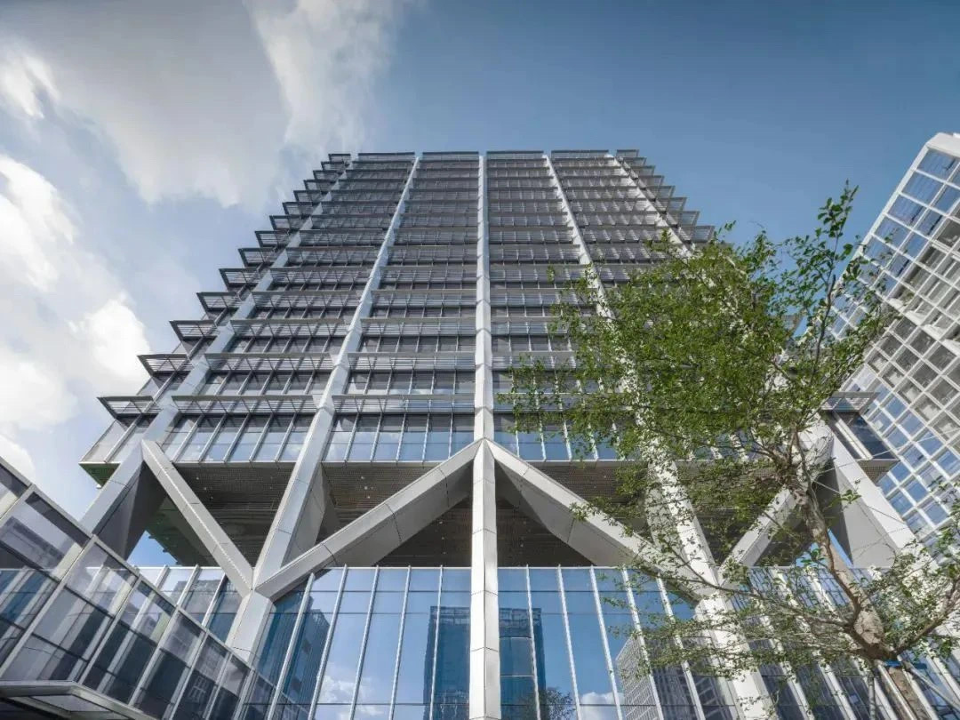 大廈在外立面設(shè)計(jì)上采用塔樓結(jié)構(gòu)突出外立面的設(shè)計(jì)方式,使得塔樓內(nèi)部形成無(wú)柱空間,極具辨識(shí)度。三種立面塔樓遮陽(yáng)設(shè)計(jì)環(huán)繞大樓不同立面形成富有韻律、獨(dú)特且連續(xù)的特色肌理,并為每個(gè)辦公樓層都提供了絕佳的景觀視野。除每層的陽(yáng)臺(tái)之外,室外景觀覆蓋四季常綠的草地與灌木,木制活動(dòng)平臺(tái)與休憩空間成為可以參觀、交流和休憩空中公共層,整體貫徹節(jié)能理念。